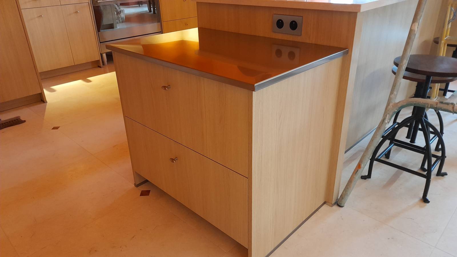 Véritable lieu de vie l’îlot central crée un ensemble harmonieux avec la décoration intérieure, il fait le lien entre les pièces. Composé d'une grande zone de préparation il apporte convivialité et praticité à cette cuisine.