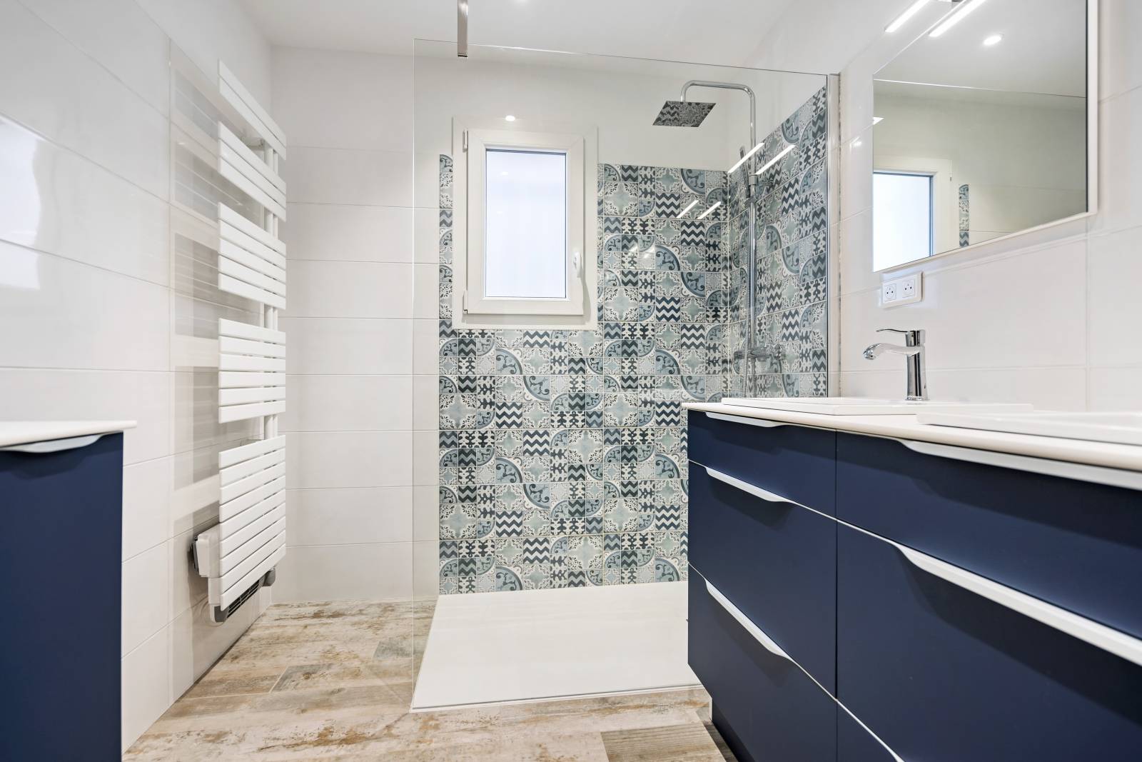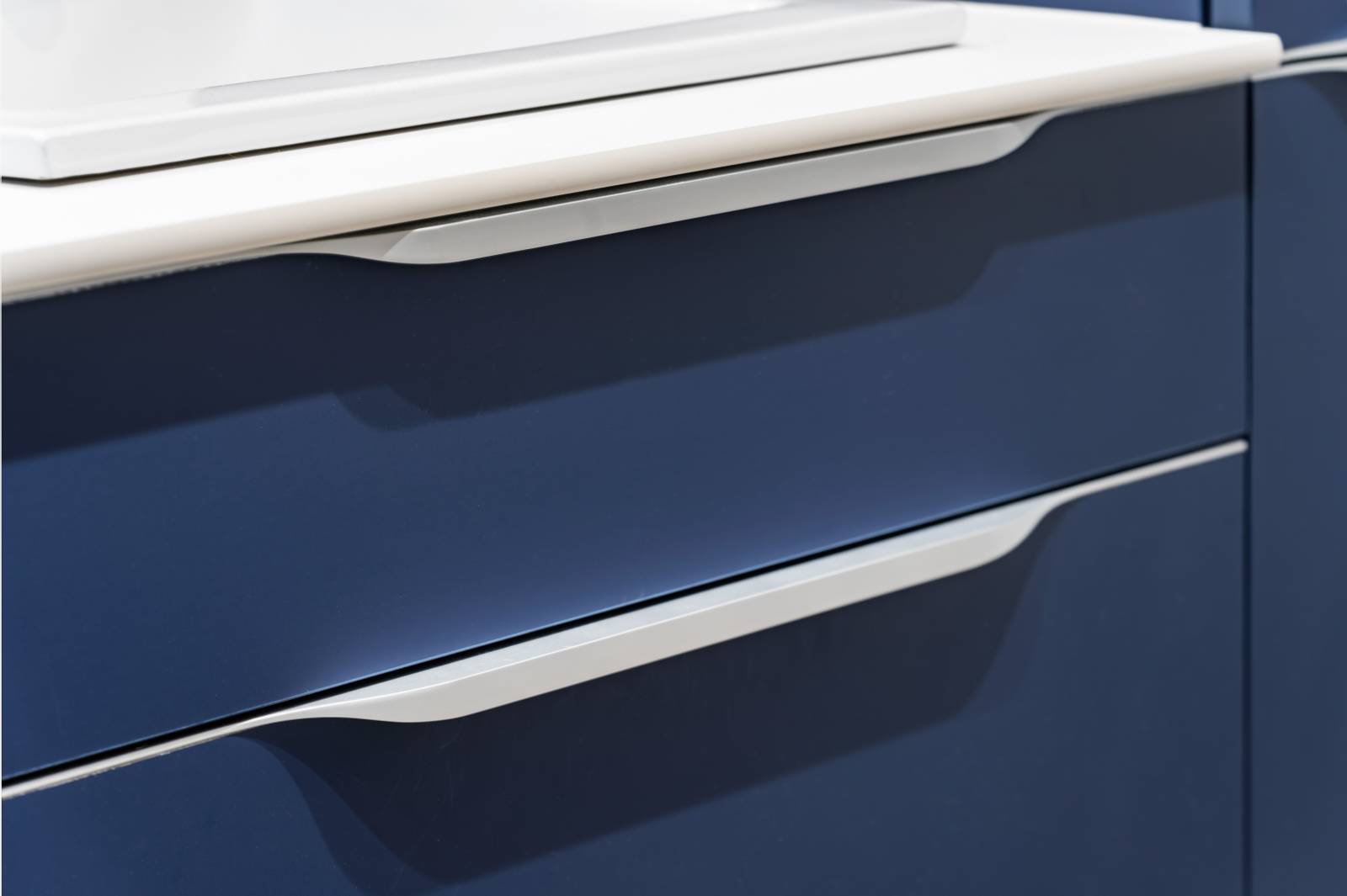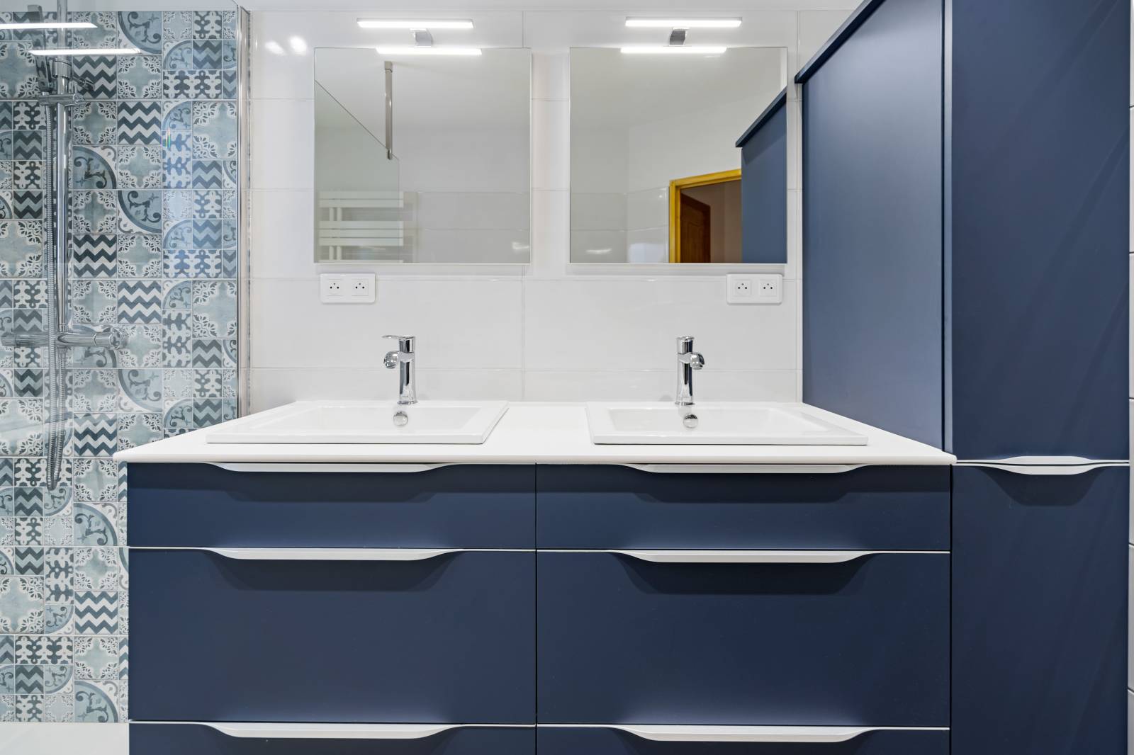 L’aménagement associe des façades en bleu saphir mat, un plan vasque en blanc lait mat et des poignées en aluminium mat, un trio de finitions qui apporte une touche contemporaine et raffinée à l’ensemble. Le tout est parfaitement mis en valeur par une faïence murale soigneusement sélectionnée, créant une atmosphère à la fois apaisante et stylée.