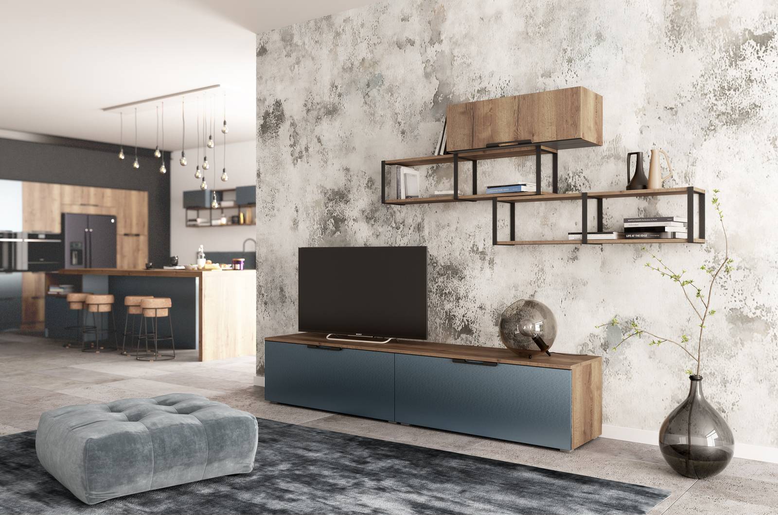 Dans cet exemple de meuble de salon, le subtil mariage entre le chêne Oléron country et le Atoll acier carbone brossé illustre parfaitement l’esprit industriel : une combinaison de matières contrastées qui évoque la robustesse tout en conservant une touche d’élégance.