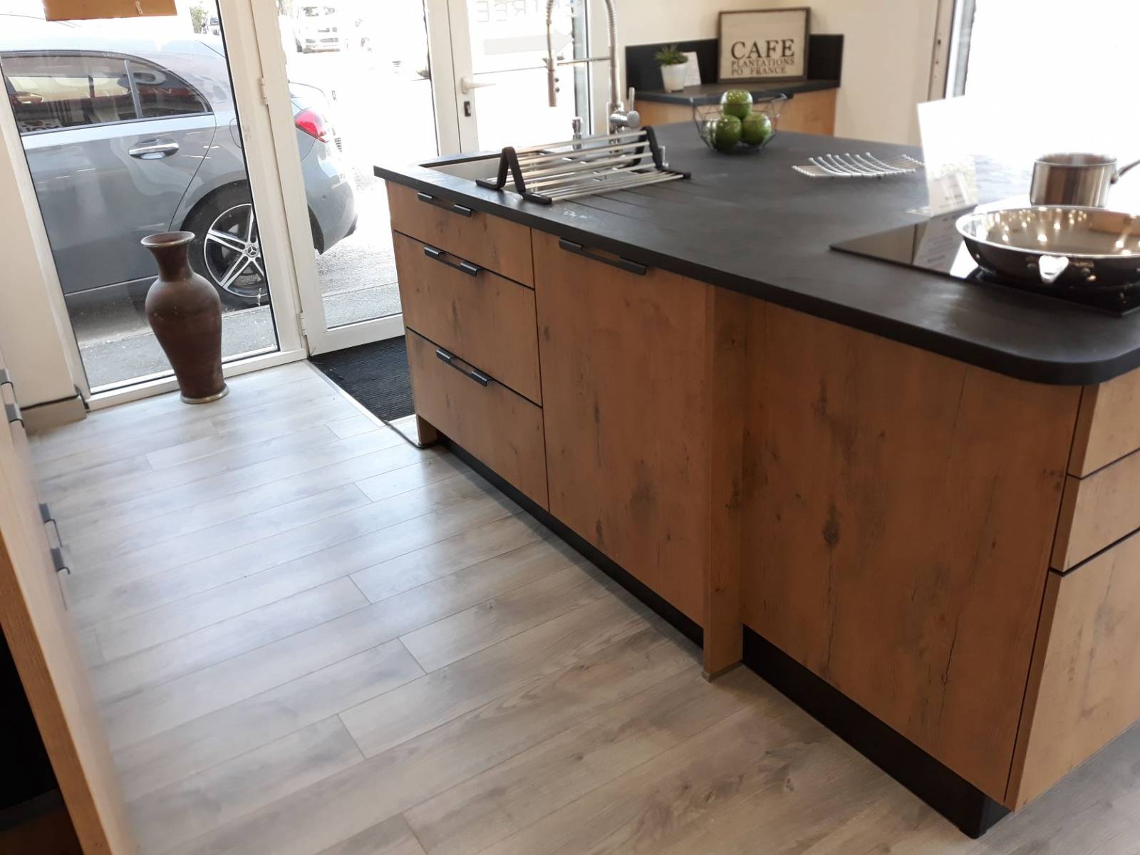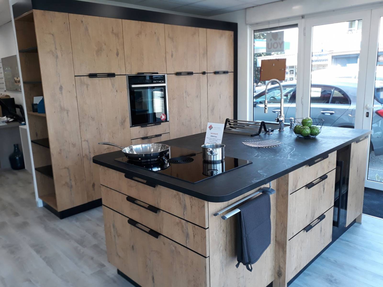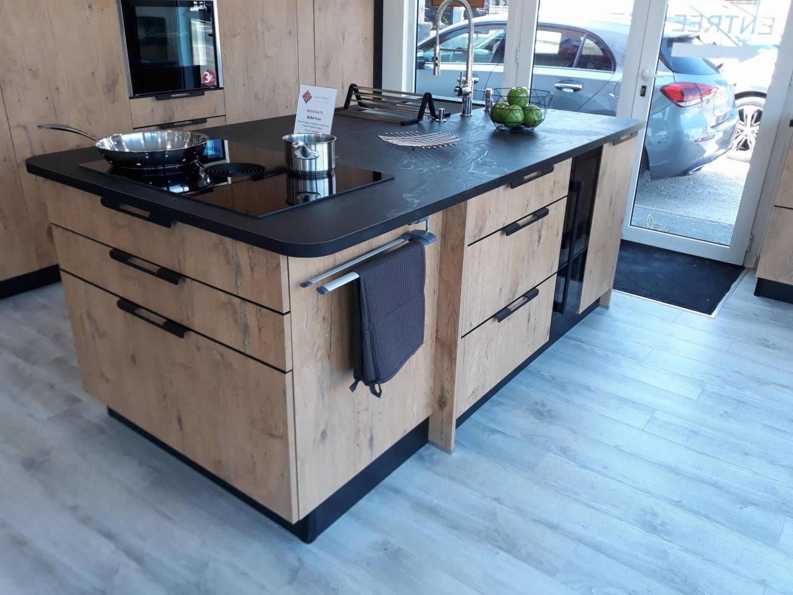 N'hésitez pas à venir découvrir la nouvelle gamme de meubles avec les nouveaux tiroirs métallique, la niche de finition en angle, les aménagements intérieurs des colonnes avec coulissants intégrés, le meuble hauts vitré cadre alu noir, les meubles en profondeur intermédiaire de 48 cm, le plan de travail en compact avec une cuve sous plan et un rainurage pour l'égouttoir et la dernière table de cuisson induction avec aspiration intégrée de chez BORA (modèle PURE).