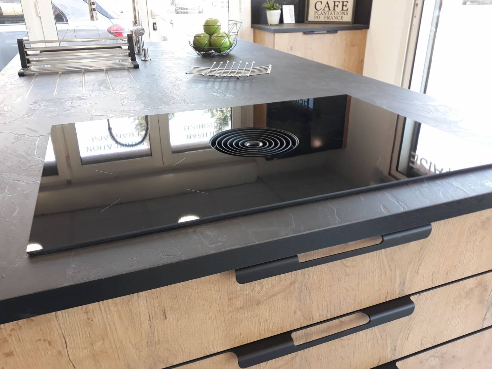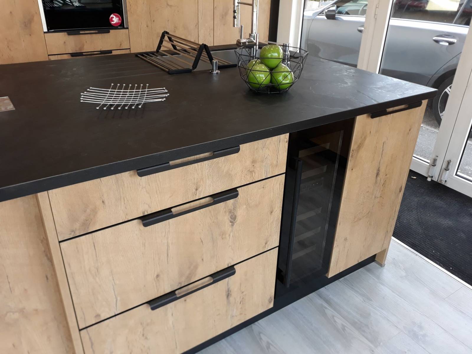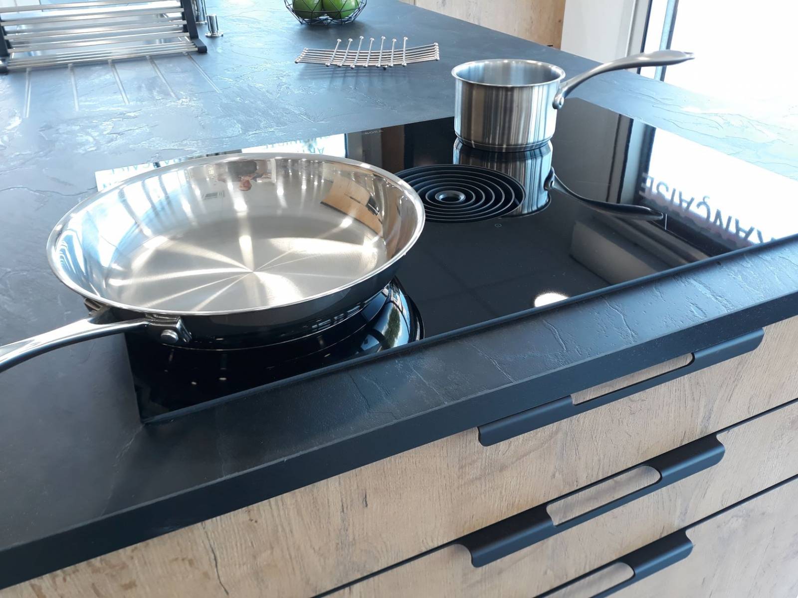 N'hésitez pas à venir découvrir la nouvelle gamme de meubles avec les nouveaux tiroirs métallique, la niche de finition en angle, les aménagements intérieurs des colonnes avec coulissants intégrés, le meuble hauts vitré cadre alu noir, les meubles en profondeur intermédiaire de 48 cm, le plan de travail en compact avec une cuve sous plan et un rainurage pour l'égouttoir et la dernière table de cuisson induction avec aspiration intégrée de chez BORA (modèle PURE).