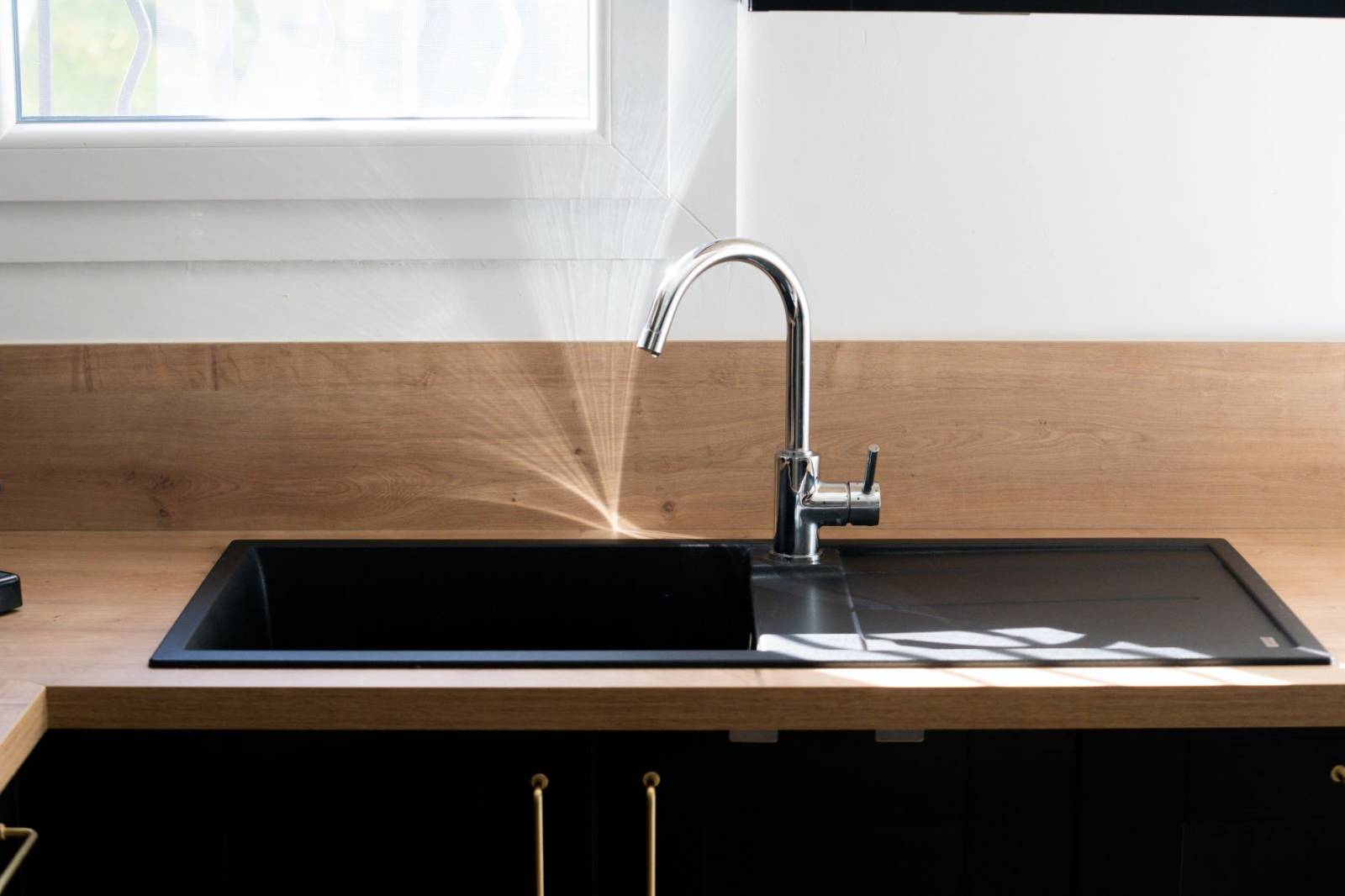 Pour cette cuisine aux façades noires aspect bois sur cadre habillées de poignées dorées et d'un plan de travail Chêne Vintage, nous avons œuvré dans un espace cuisine fermé.