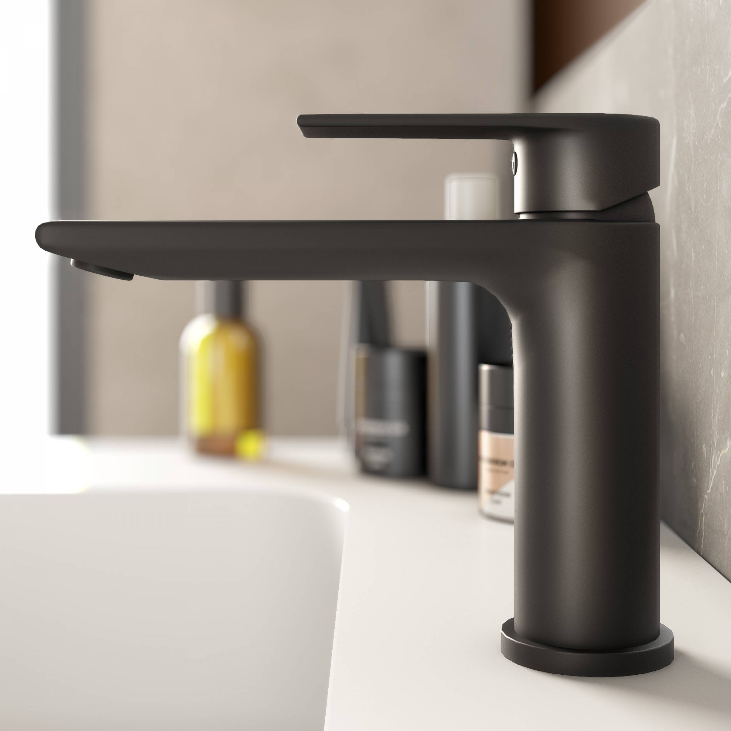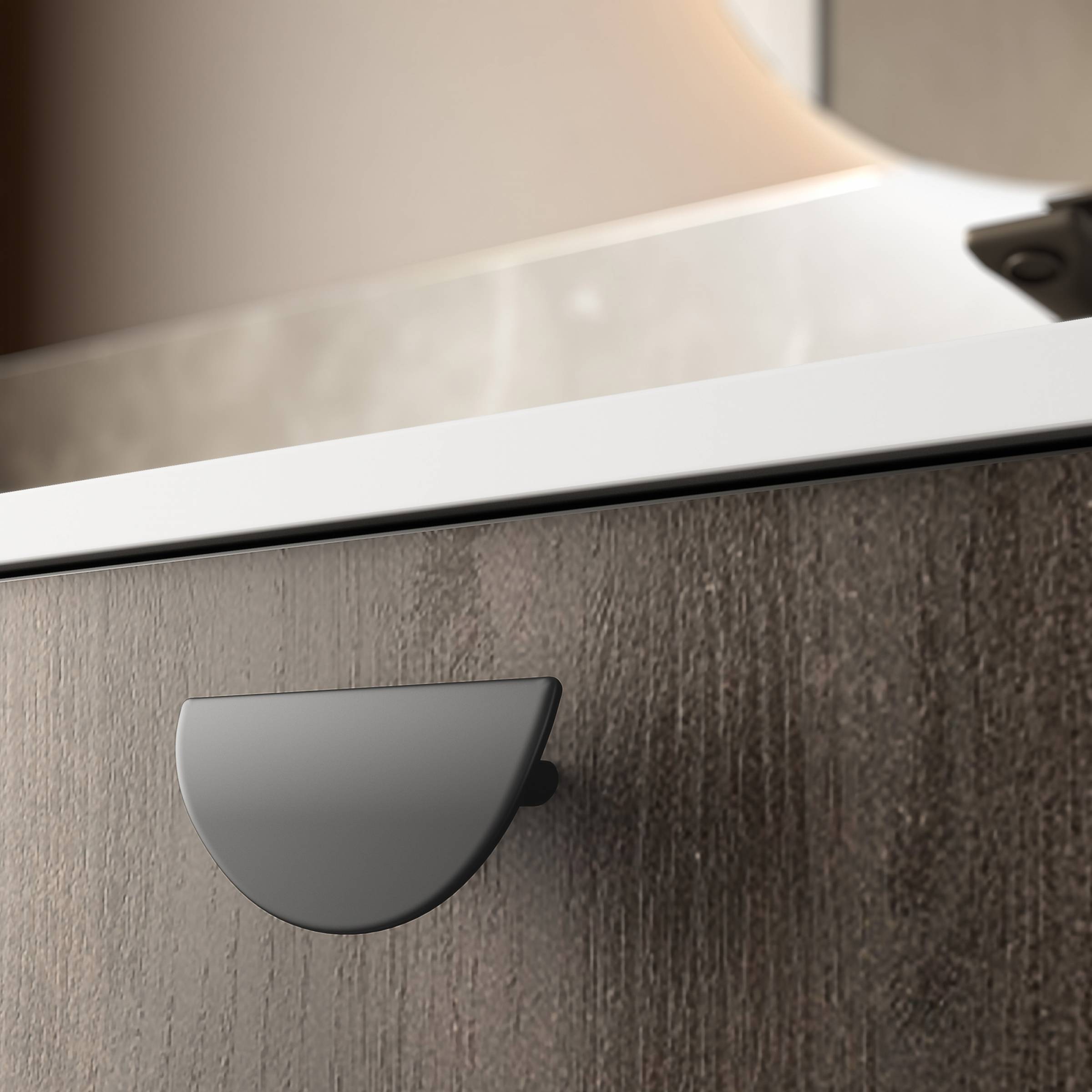 Le mitigeur noir mat fait le lien avec les poignées et accentue le caractère de la salle de bain. De finition mate, le toucher est soyeux et agréable : esthétisme et fonctionnalité ne font qu’un.
