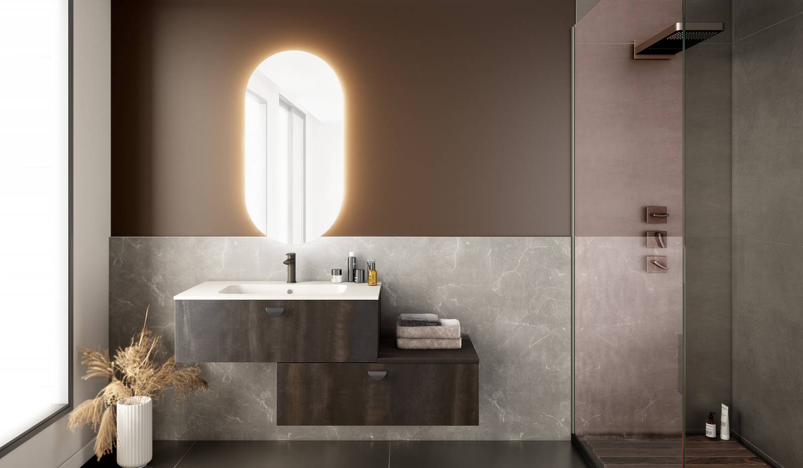 Le miroir ovale avec rétro éclairage LED renforce le côté design de la pièce et permet un éclairage léger, moins agressif le matin…