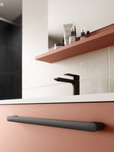 Les teintes terracotta de la pièce s’associent parfaitement au noir mat, présent par touches grâce aux poignées et au mitigeur.